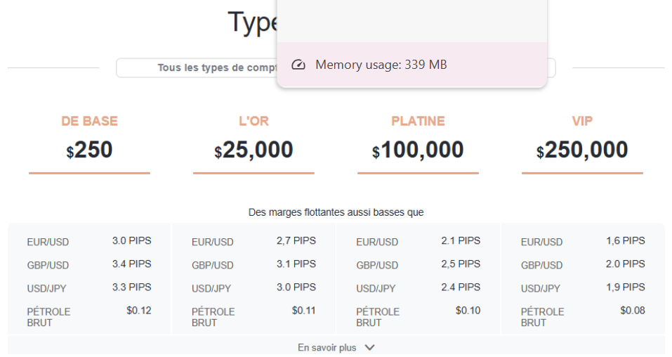 Le compte VIP exige un dépôt minimum de 250 000 $. Il propose les spreads les plus compétitifs de la plateforme, à partir de 1,6 pips pour EUR/USD, 2,0 pips pour GBP/USD et 1,9 pips pour USD/JPY. Les traders VIP bénéficient de retraits illimités sans frais.